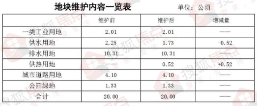 该地块维护后,供水用地减少0.52公顷(约合7.8亩),供热用地增加0.52公顷(约合7.8亩),城市道路用地、公园绿地、一类工业用地、排水用地保持不变。