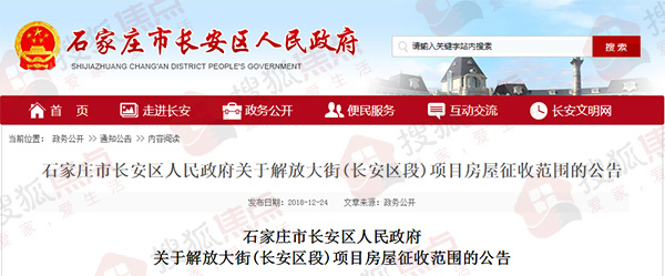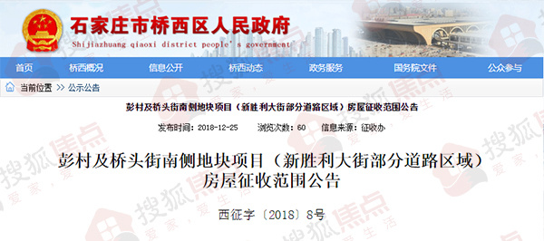 搜狐焦点“楼市快讯”报道:12月25日,搜狐焦点获悉,桥西区和长安区政府网站分别发布了《彭村及桥头街南侧地块项目(新胜利大街部分道路区域)房屋征收范围公告》和《关于解放大街(长安区段)项目房屋征收范围的公告》。