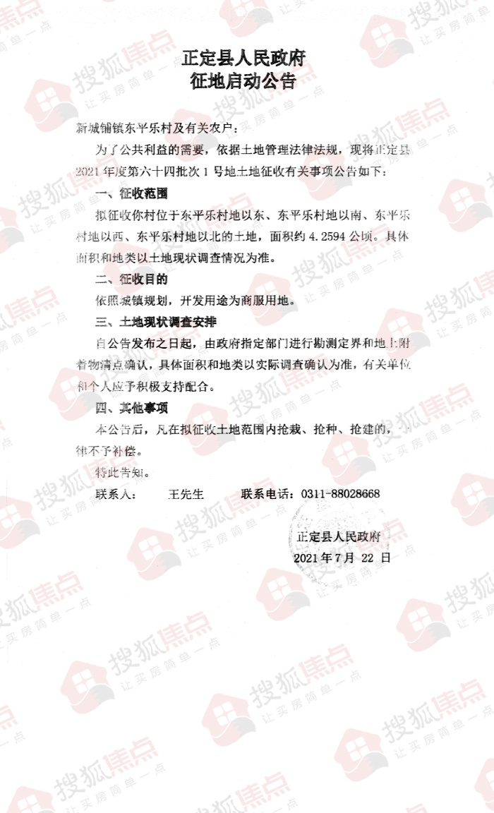 搜狐焦点“楼市快讯”报道:7月23日,搜狐焦点获悉,正定县人民政府发布了一则征地启动公告,拟征收新城铺镇东平乐村4.2594公顷(约合63.891亩)土地。依照城镇规划,开发用途为商服用地。