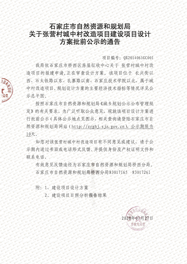 搜狐焦点“楼市快讯”报道:7月31日,搜狐焦点获悉,石家庄市自然资源和规划局发布了《关于张营村城中村改造项目建设项目设计方案批前公示的通告》。