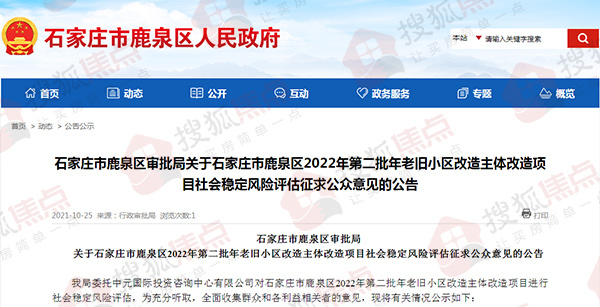 10月26日消息,搜狐焦点获悉,鹿泉区政府网站发布了关于石家庄市鹿泉区2022年第二批老旧小区改造主体改造项目社会稳定风险评估征求公众意见的公告。