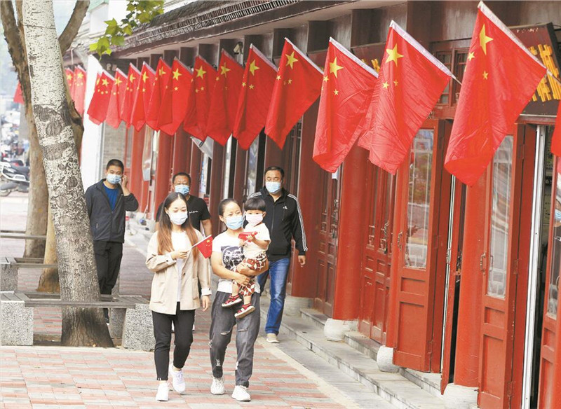 钟旺路商铺门前挂起鲜艳的五星红旗,大人孩子沐浴在幸福时光。记者杜慧摄