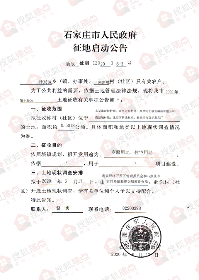 搜狐焦点“楼市快讯”报道:6月19日,搜狐焦点获悉,石家庄市鹿泉区人民政府网站发布了1则征地公告,涉及开发区南新城村共计9.027亩地。