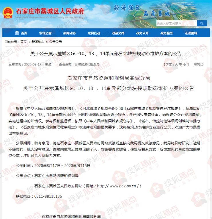 搜狐焦点“楼市快讯”报道:近日,搜狐焦点获悉,藁城区人民政府发布了《关于公开展示藁城区GC-10、13 、14单元部分地块控规动态维护方案的公告》。