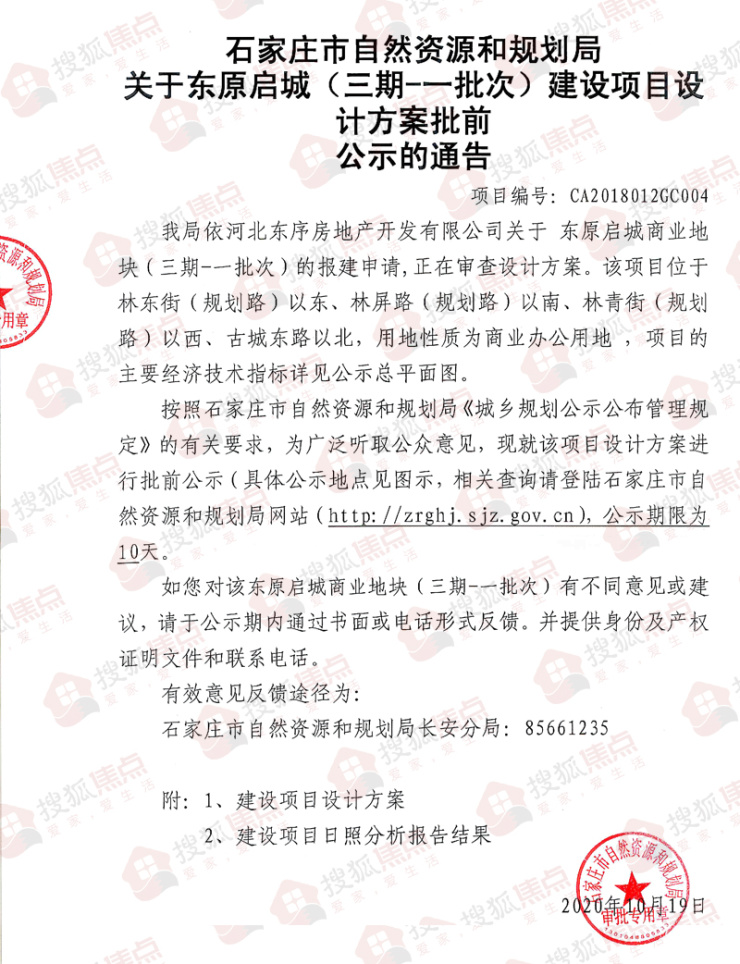 搜狐焦点“楼市快讯”报道:10月20日,搜狐焦点获悉,石家庄市自然资源和规划局发布《关于东原启城(三期-一批次)建设项目设计方案批前公示的通告》。