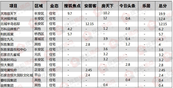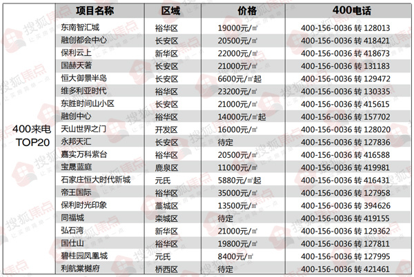 根据搜狐焦点统计显示1-2月搜狐焦点400来电环比下降16.84%。1-2月来电量排名前20的房地产项目分别为:东南智汇城、融创都会中心、国赫天着、保利云上、恒大御景半岛、维多利亚时代、东胜时间山小区、融创中心、天山世界之门、永邦天汇、嘉实万科紫台、宝晟蓝庭、石家庄恒大时代新城、帝王国际、保利时光印象、同福城、弘石湾、国仕山、碧桂园凤凰城、利航棠樾府,大多集中在主城区。