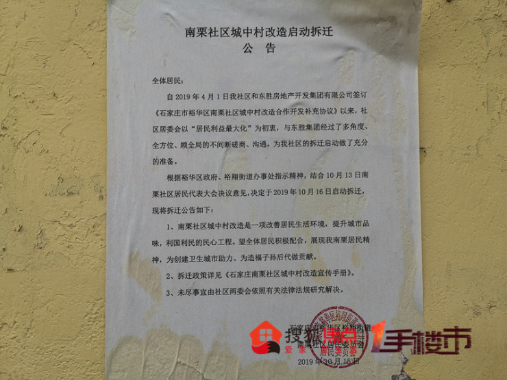 而两份直接决定南栗改造命运的文件:《南栗社区城中村改造启动拆迁公告》与《石家庄市裕华区南栗社区城中村改造拆迁补偿及回迁安置明白书》,均发布于2019年10月。《南栗社区城中村改造启动拆迁公告》中明确表明,“自2019年4月1日我社区和东胜房地产开发集团有限公司签订《石家庄市裕华区南栗社区城中村改造合作开发补充协议》以来,社区居委会以‘居民利益较大化’为初衷,与东胜集团经过了多角度、全方位、顾全局的不间断磋商、沟通,为我社区的拆迁启动做了充分准备。……决定于2019年10月16日启动拆迁。”