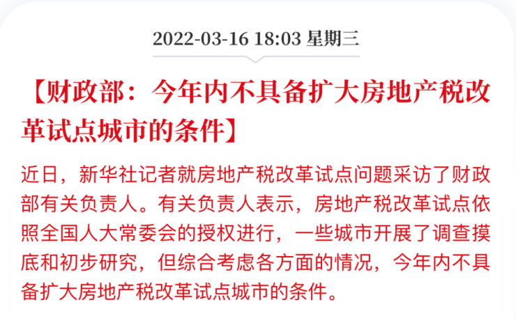 3月16日,财政部突然发了一条简单的新闻,表明今年不具备扩大房地产税改革试点城市的条件。寥寥数字,透露了两个信号:1、高层确实针对房地产税做了调查摸底,2、调查下来发现,这事儿今年办不成。