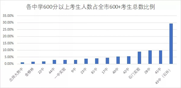 上图出现的15所中学600分以上考生人数总计737人,占全市600分以上考生总人数的95%左右,所以没有出现在表中的学校,基本就没有讨论必要了,下文会提一些比较知名但没有公布中考成绩的学校。
