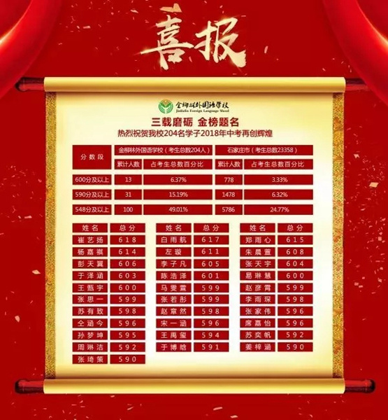 2018年中考,石家庄主城区共23358人参考,600分以上共778人,通过搜寻15所名校的“喜报”,可以得到以下数据。