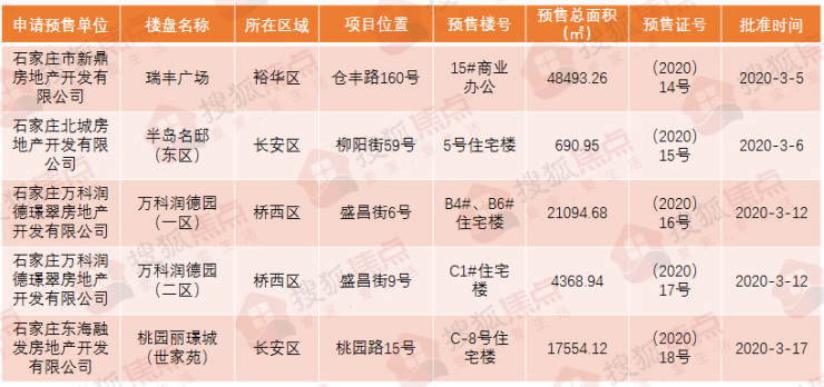 搜狐焦点“楼市快讯”报道:3月20日,搜狐焦点从石家庄市行政审批局网站获悉,3月截止到17日,石家庄有4个房地产项目新获5张预售证,涉及项目包括瑞丰广场、半岛名邸(东区)、万科润德园(一区、二区)、桃园丽璟城(世家苑)。