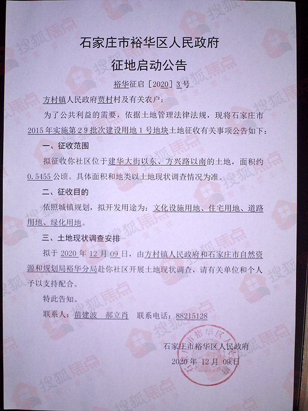 搜狐焦点“楼市快讯”报道:12月9日,搜狐焦点获悉,裕华区发布一则征地启动公告,涉及莱茵春天二期地块0.5455公顷(约合8.1825亩)土地,开发用途为文化设施用地、住宅用地、道路用地、绿化用地。
