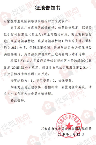 鹿泉区政府网站发布了一则征地告知书,具体来看,拟征收土地位于南铜冶村村东北。