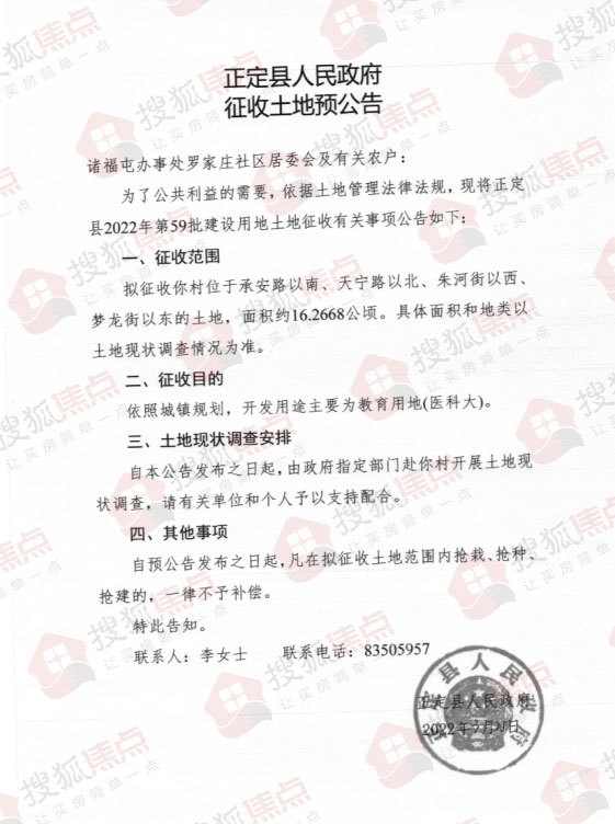 搜狐焦点“楼市快讯”报道:3月25日,搜狐焦点获悉,正定县人民政府发布了一则征收土地预公告,拟征收诸福屯办事处罗家庄村244.002亩土地用于建设医科大学项目。