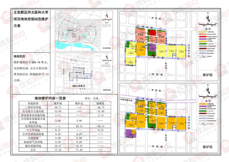 公示显示,正定新区河北医科大学项目维护地块位于安济路以南、太行大街以西、梦龙街以东,用地面积77.35公顷(约合1160.25亩)。地块维护后,公共服务设施混合商业用地3公顷,高等院校用地49.14公顷,公共交通场站用地0.25公顷,公园绿地5.39公顷,加油加气站用地0.20公顷,城市道路用地19.37公顷。