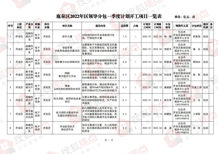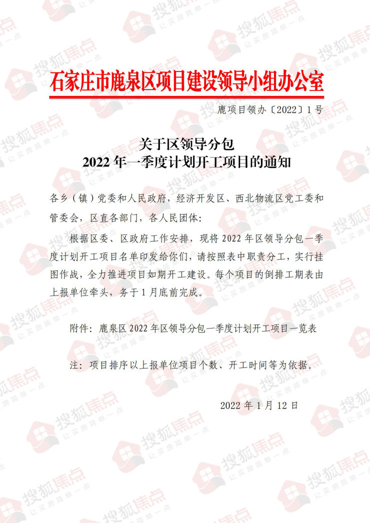搜狐焦点“楼市快讯”报道:1月28日,搜狐焦点获悉,鹿泉区政府网站发布了关于2022年区领导分包一季度计划开工项目的通知。