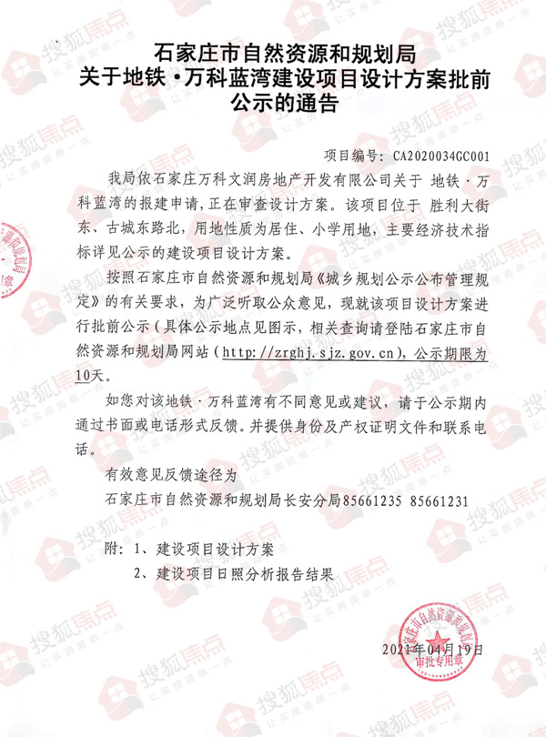 搜狐焦点“楼市快讯”报道:4月20日,搜狐焦点获悉,石家庄市自然资源和规划局发布了关于地铁·万科蓝湾建设项目设计方案批前公示的通告。