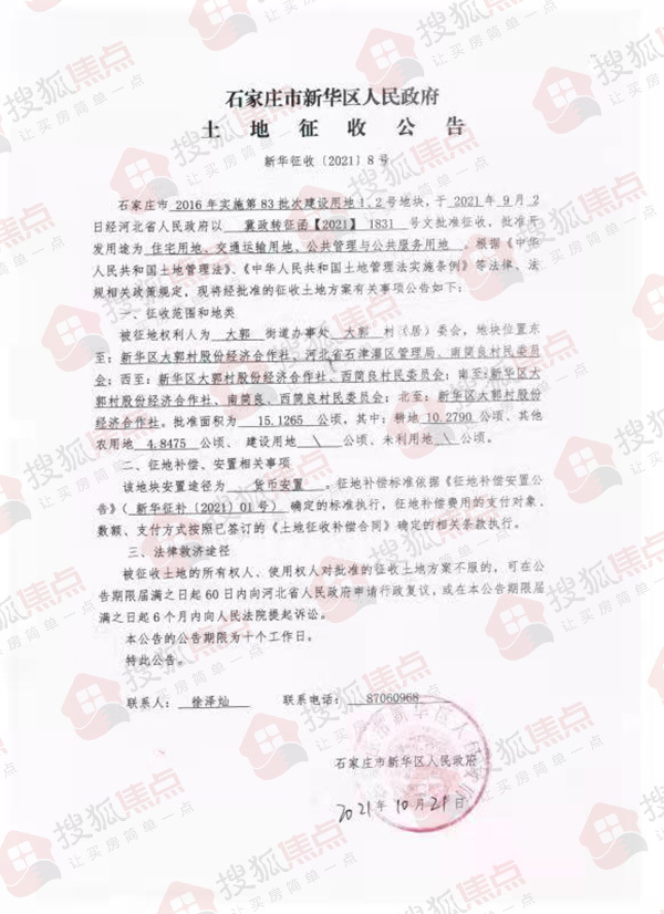 拟征收大郭村,东至新华区大郭村股份经济合作社、河北省石津灌区管理局、南简良村民委员会,西至新华区大郭村股份经济合作社、西简良村民委员会,南至新华区大郭村股份经济合作社、南简良、西简良村民委员会,北至新华区大郭村股份经济合作社。批准开发用途为住宅用地、交通运输用地、公共管理与公共服务用地,批准面积为15.1265公顷(约合226.8975亩),安置途径为货币安置。