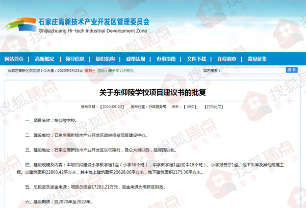 搜狐焦点“楼市快讯”报道:9月23日,搜狐焦点获悉,石家庄市高新区管委会发布《关于东仰陵学校项目建议书的批复》。