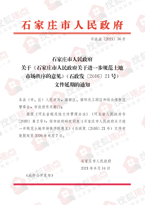 通知显示,根据《河北省规范性文件管理办法》(河北省人民政府令〔2020〕第2号),经市政府研究同意《石家庄市人民政府关于进一步规范土地市场秩序的意见》(石政发〔2016〕21号)文件有效期延至2026年6月7日。