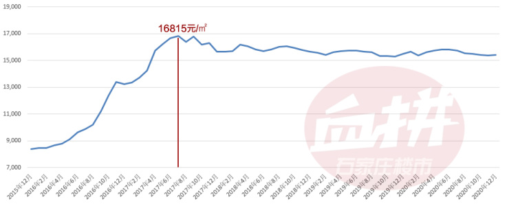 从图中可以发现,石家庄房价在2015年底开始大幅上扬,之后是2016年的“疯狂”,较高点出现在2017年7月,达到了16815元/㎡。之后出现小幅回落,按照此数据来看,至2020年12月,整体跌幅在10%以内。
