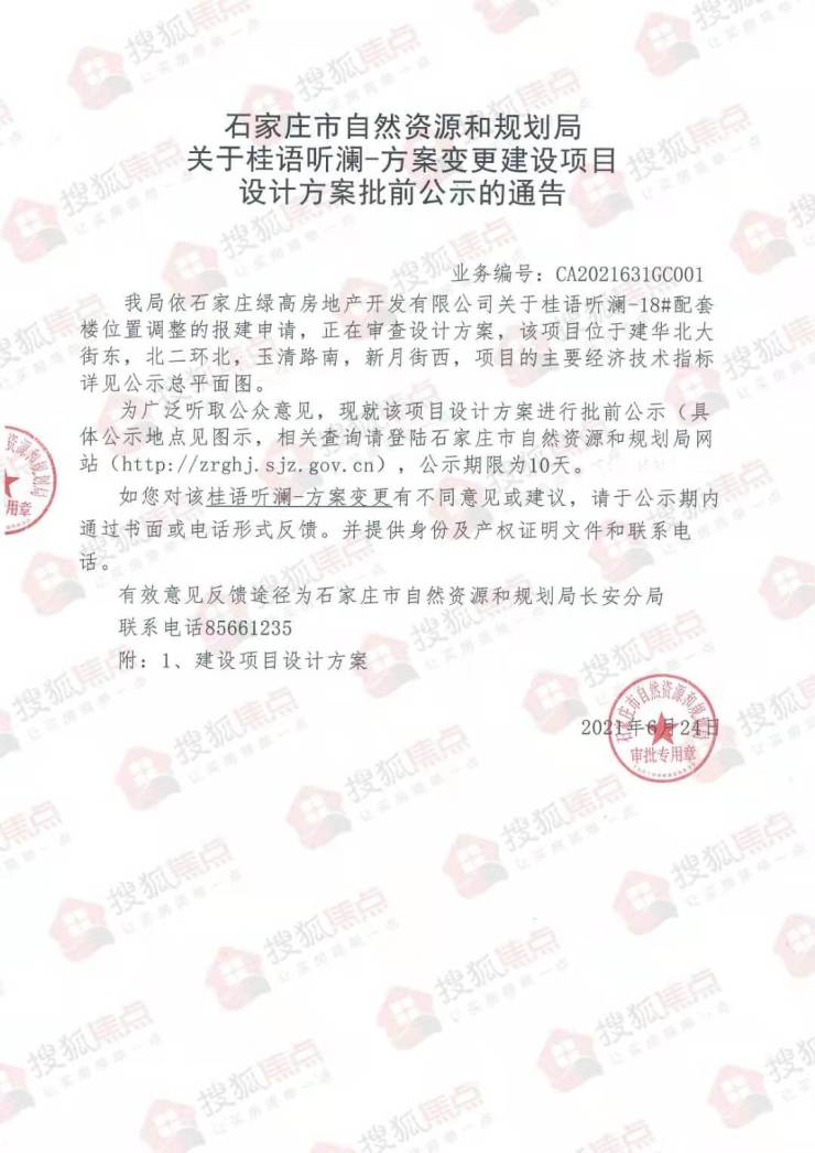 搜狐焦点“楼市快讯”报道:7月5日,搜狐焦点获悉,石家庄市自然资源和规划局发布了一则《关于桂语听澜-方案变更建设项目设计方案批前公示的通告》。