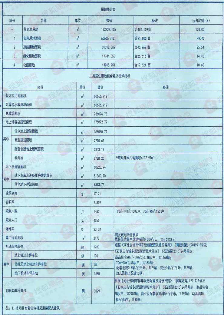 根据建设项目设计方案及地块经济技术指标表显示,该项目总用地面积60666.712平方米(约合91亩),总建筑面积236096.73平方米,住宅面积175424.53平方米,商业建筑面积2730.67平方米,幼儿园建筑面积2738.20平方米,绿地率35%,容积率2.899,建筑密度17.71%,机动车停车位1780辆,可居住人数4356人,容纳户数1452户。规划建设15栋住宅以及商业、幼儿园等配套。
