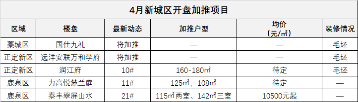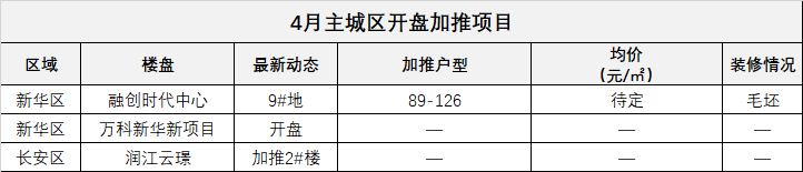 主城区中,4月计划加推的是新华区的融创时代中心和长安区的润江云璟,预计开盘的是万科新华区新项目。