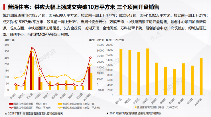 焦点研究:融创旗下在石家庄的两个项目进入新一轮强推期。其中,融创中心供应结构有一定调整,继一期后,新增建筑面积超过200平方米的户型供应。同期东南智汇城新增洋房供应,建筑面积193至227平方米,将与融创中心大平层新房源形成一定竞品关系。加之同期全市大户型供应规模显著放大,但大户型面向的改善需求却为全市范围内,融创中心大平层、东南智汇城洋房势必将面对全市大户型项目供应产生的分流作用。融创未来中心项目完成产品发布,后续营销动作将逐步展开,预计开盘销售时间应在6月底至7月,项目定价尚未确定,但高于高新区当前价格水平已成必然,其入市也将改变此前高新区本地房企开发项目交易为主、面向首置刚需产品交易为主的格局。