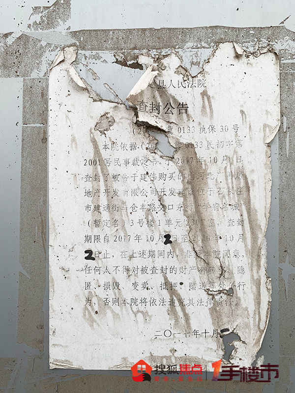 紧邻项目东侧的便是学府名城售楼部,目前售楼部已于5月22日被石家庄市裕华区人民政府贴上封条。在玻璃门上,于2017年张贴的查封公告还依稀可见。