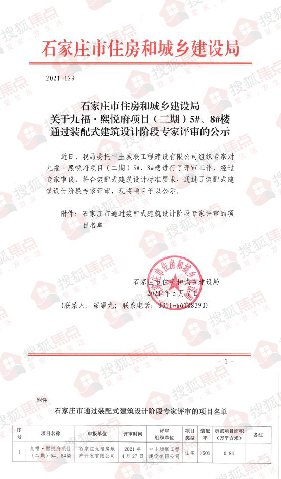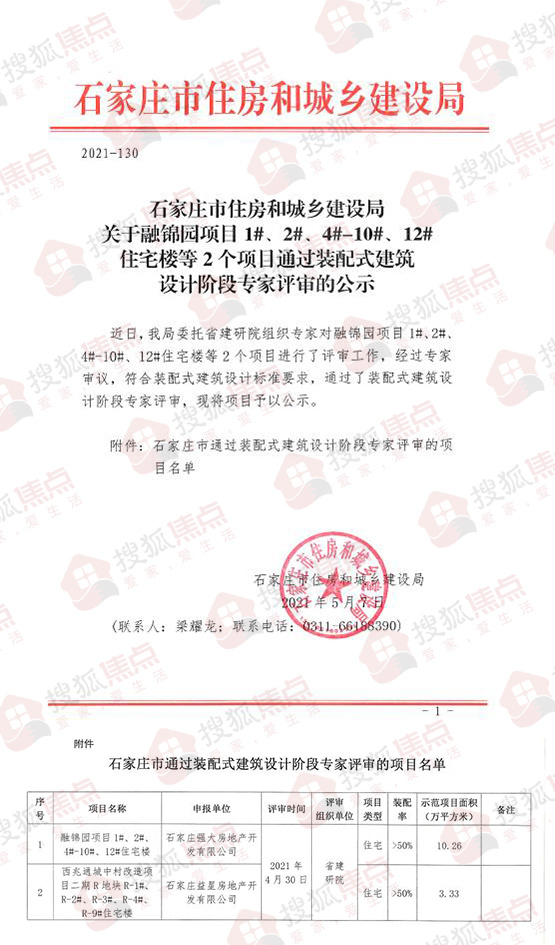 搜狐焦点“楼市快讯”报道:5月7日,搜狐焦点从石家庄市住房和城乡建设局官网获悉,融锦园项目1#、2#、4#-10#、12#住宅楼、西兆通城中村改造项目二期R地块R-1#、R-2#、R-3#、R-4#、R-9#住宅楼、九福·熙悦府项目(二期)5#、8#楼通过装配式建筑设计阶段专家评审。