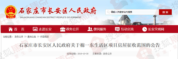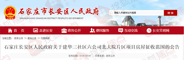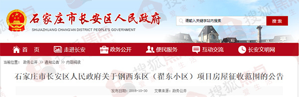 搜狐焦点“楼市快讯”报道:近日,搜狐焦点获悉,长安区政府网站发布了三则房屋征收公告,涉及建华三社区六公司北大院片区项目、钢西东区(翟东小区)项目以及棉一东生活区项目。