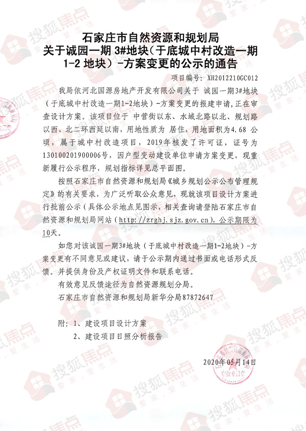 搜狐焦点“楼市快讯”报道:5月15日,据搜狐焦点获悉,石家庄市自然资源和规划局官网发布了《关于诚园一期3#地块(于底城中村改造一期1-2地块)-方案变更的公示通告》。