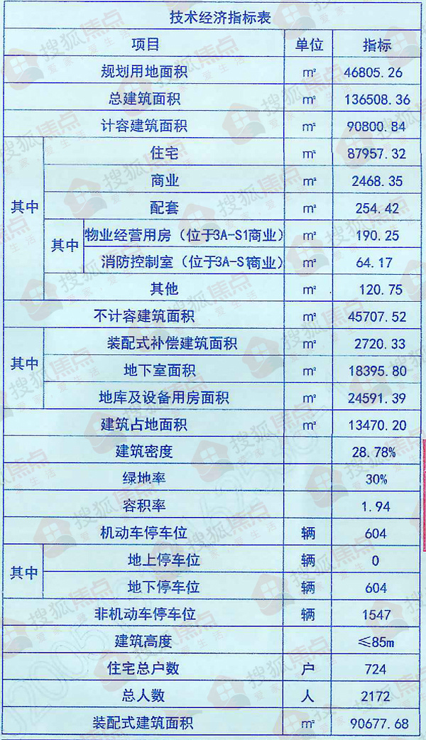 根据总平面图,项目规划用地46805.26平方米(约70.20795亩),总建筑面积136508.36平方米,建筑密度28.78%,绿地率30%,容积率1.94,机动车停车位604辆,非机动车停车位1547辆。