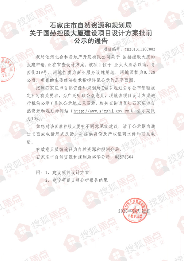 搜狐焦点“楼市快讯”报道:4月23日,搜狐焦点获悉,石家庄市自然资源和规划局发布了《关于国赫控股大厦公示建设项目设计方案批前公示的通告》。