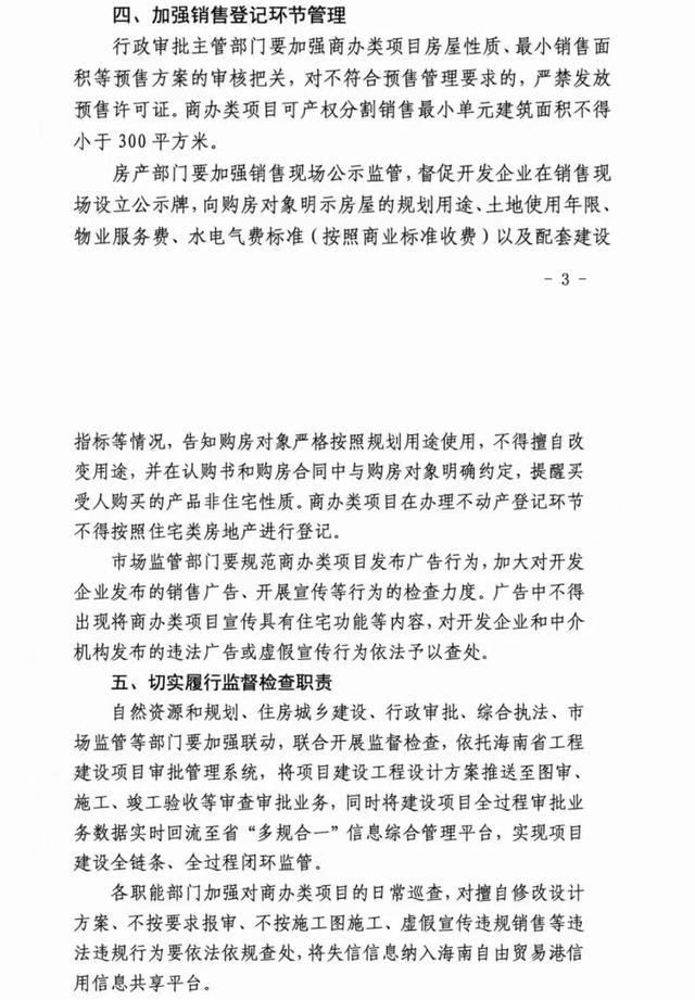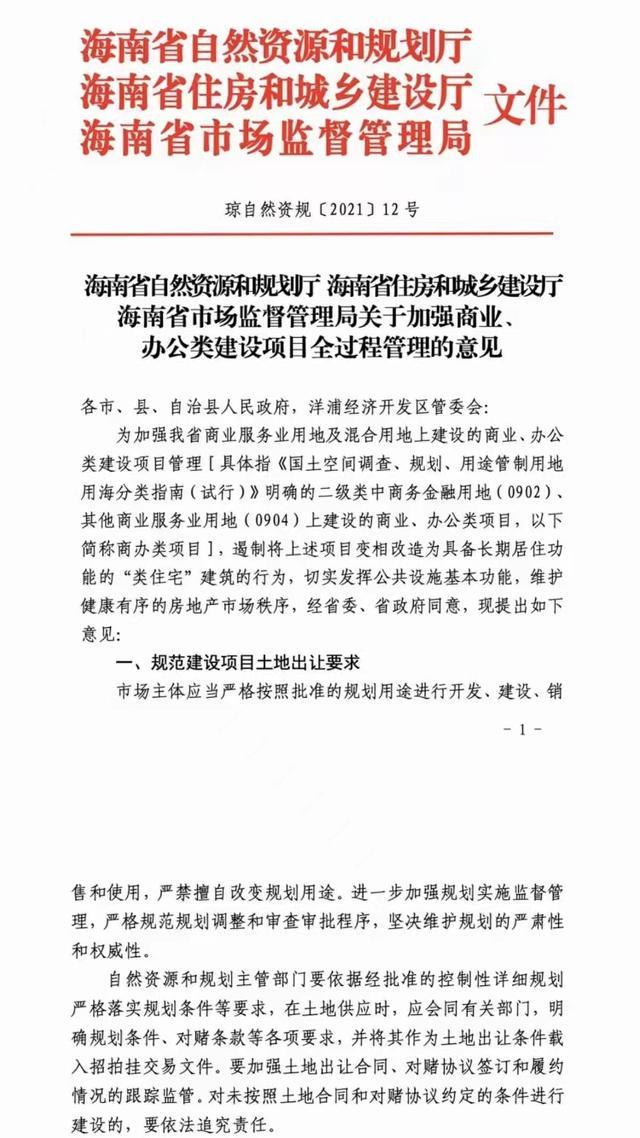 10月12日,为加强海南省商业服务业用地及混合用地上建设的商业、办公类建设项目管理,遏制将项目变相改造为具备长期居住功能的“类住宅”建筑的行为,切实发挥公共设施基本功能,维护健康有序的房地产市场秩序,海南省自然资源和规划厅、海南省住房和城乡建设厅、海南省市场监督管理局联合发布了《关于加强商业、 办公类建设项目全过程管理的意见》(以下简称“意见”)“商办类项目”新规。