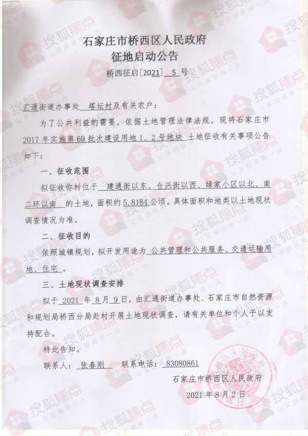 搜狐焦点“楼市快讯”报道:8月4日,搜狐焦点获悉,石家庄市桥西区人民政府发布了两则征地公告,拟征收汇通街道办事处塔坛村和留村两村共10.4942公顷(约合157.413亩)土地。依照城镇规划,开发用途为住宅、商业、交通运输用地、公共管理与公共服务用地 。