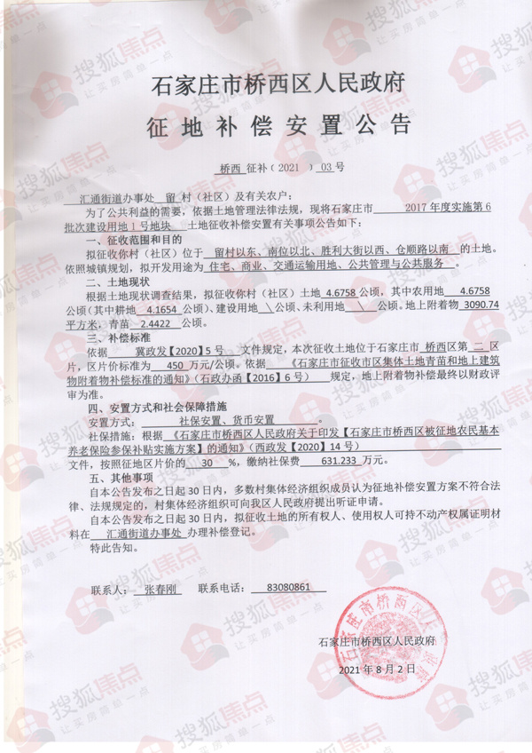 拟征收汇通街道办事处留村位于留村以东、南位以北、胜利大街以西、仓顺路以南的土地,征收土地面积为4.6758公顷(约合70.137亩)。依照城镇规划,开发用途为住宅、商业、交通运输用地、公共管理与公共服务用地 。本次征收土地位于石家庄市桥西区第二区片,区片价标准为450万元/公顷。安置方式为社保安置、货币安置。