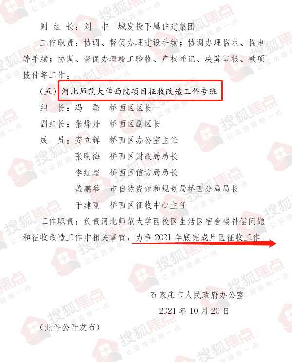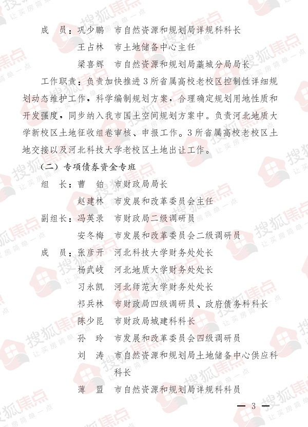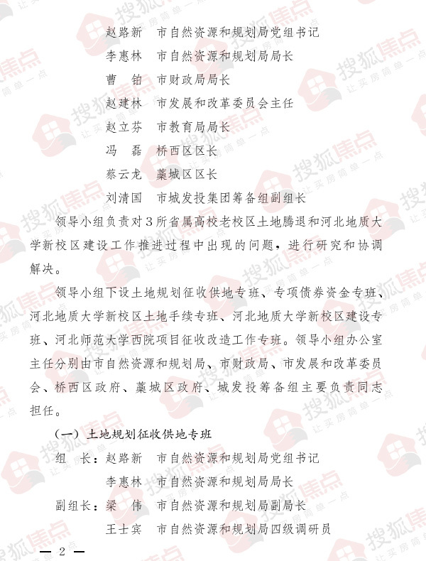 通知显示,领导小组下设土地规划征收工地专班、专项债券资金专班、河北地质大学新校区土地手续专班、河北地质大学新校区建设专班、河北师范大学西院项目征收改造工作专班。