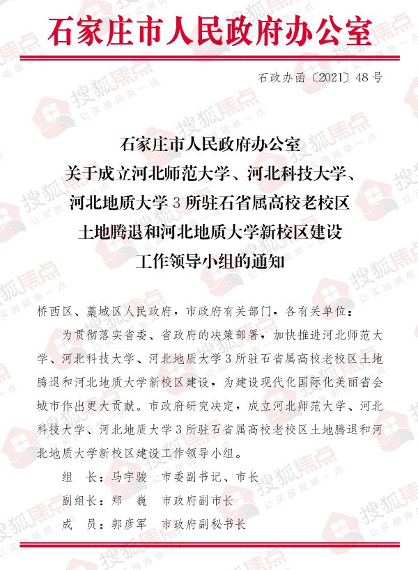 搜狐焦点“楼市快讯”报道:10月22日,搜狐焦点获悉,石家庄市政府网站发布了关于成立河北师范大学、河北科技大学、河北地质大学3所驻石省属高校老校区土地腾退和河北地质大学新校区建设工作领导小组的通知。