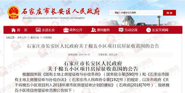 棉五小区改造首次发布房屋征收公告是在2018年9月,石家庄市长安区人民政府发布了关于棉五小区项目房屋征收范围的公告,随后又发布了棉五小区项目房屋征收补偿具体方案。