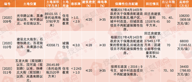 搜狐焦点“焦点地评线”报道:2月21日,搜狐焦点获悉,石家庄市公共资源交易中心发布了一则国有土地使用权挂牌出让公告,涉及3宗地,挂牌地块编号为[2020]009-011号,总面积为161606.15平方米(约合242.41亩),总起始价为210600万元(21.06亿元),土地用途分别为住宅、商服、教育,城镇住宅以及住宅、教育用地,2020年3月25日14时35分开始限时竞价,地点为石家庄市公共资源交易中心电子竞价室。