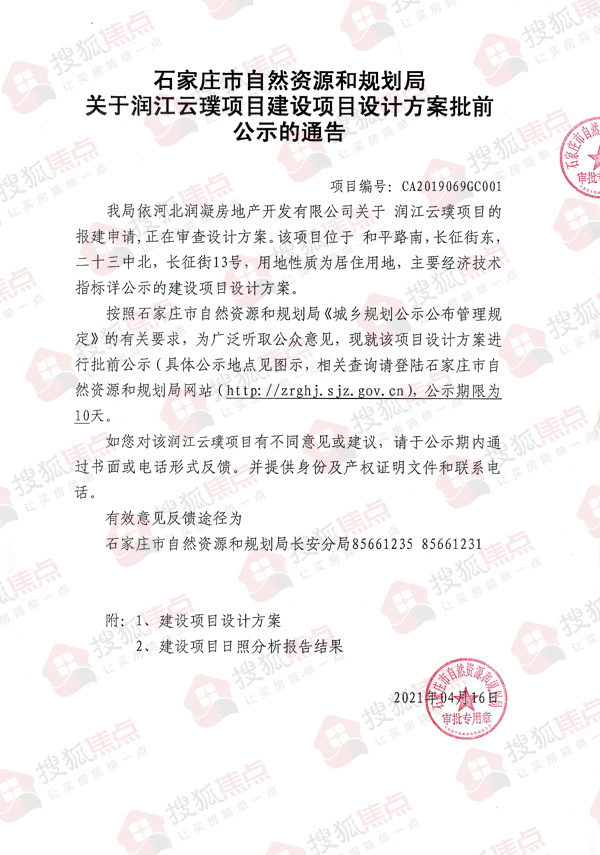 搜狐焦点“楼市快讯”报道:4月19日,搜狐焦点获悉,石家庄市自然资源和规划局发布了关于润江云璞项目建设项目设计方案批前公示的通告。