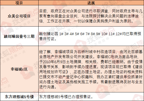 具体来看,涉及项目包括融创臻园壹号三期、众美公司项目、幸福城c区、东方理想城、方村、宋村、东京北村、西三教村、平安南大街133号院、新石生活小区、北庄村、昆仑大街南延工程。