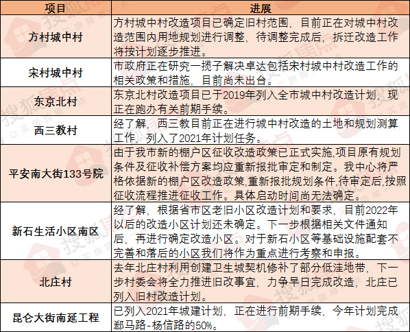 方村镇:方村城中村改造项目已确定旧村范围,目前正在对城中村改造范围内用地规划进行调整,待调整完成后,拆迁改造工作将按计划逐步推进。