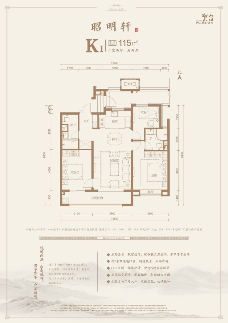 嘉实万科紫台建筑面积约115㎡ 三室两厅一卫户型图