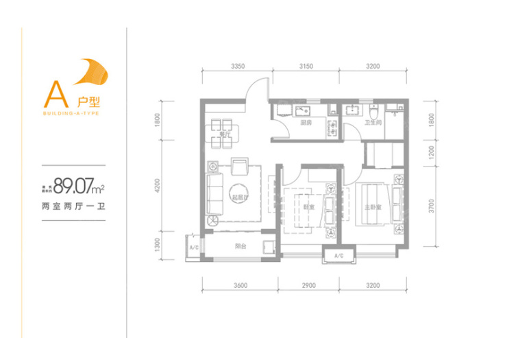 融创城建筑面积约89.07㎡两室两厅一卫户型图