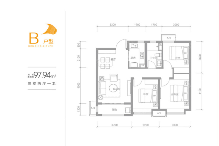 融创城建筑面积约97.94㎡三室两厅一卫户型图