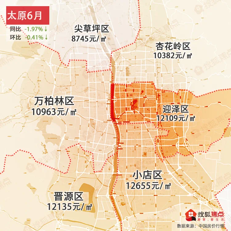 太原6月均价为11543元/㎡,同比下跌-1.97%↓,环比下跌-0.41%↓