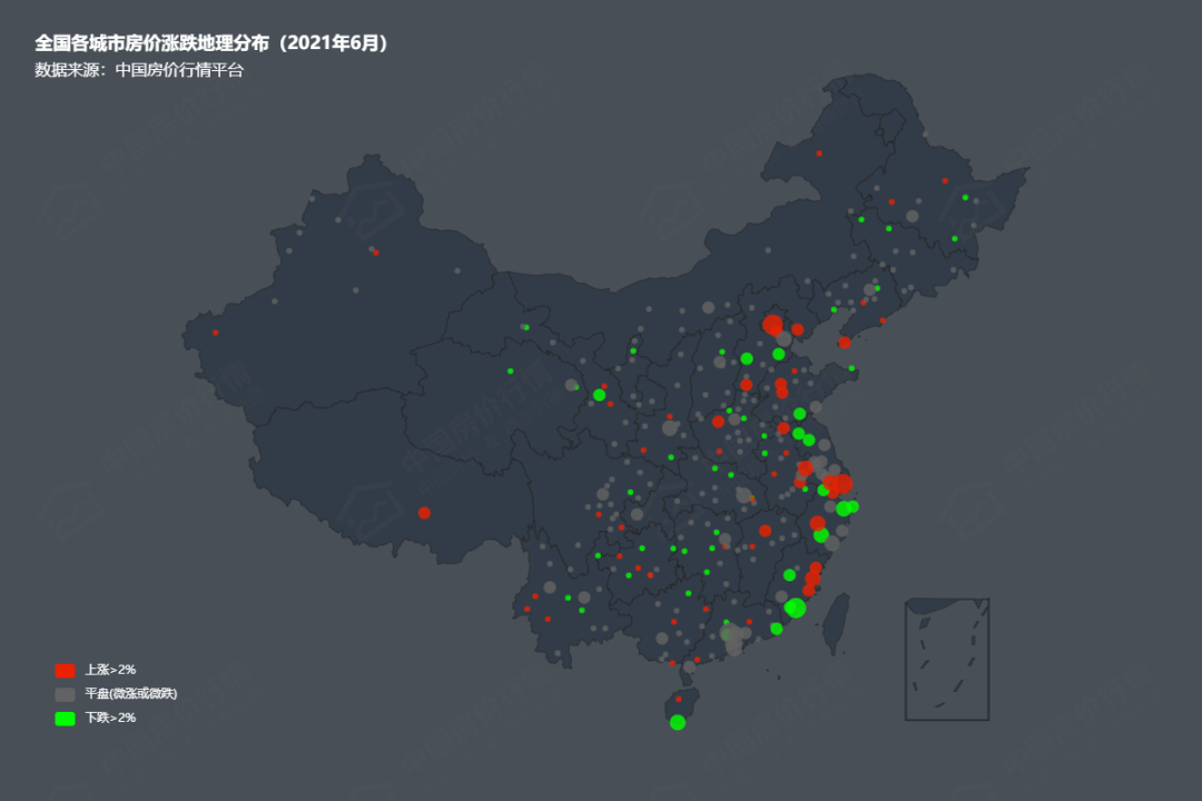大部分城市房价趋于平稳,其中房价上涨的(环比涨幅超过2%)城市数量略少于房价下降(环比跌幅超过2%)的城市数量。